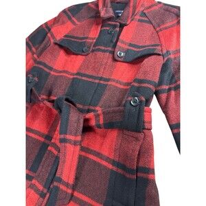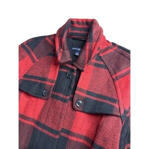 Stay cozy and stylish in this classic Gap buffalo plaid trench coat. Featuring a bold red and black check pattern, this mid-length coat combines timeless style with functional warmth. Designed with a belted waist for a flattering silhouette, button front closure, and chest flaps for added detail. Perfect for layering on chilly days or adding a pop of pattern to your fall and winter wardrobe.