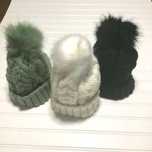 Gap Bundle of (3) Faux Fur Cable Knit Beanie with Poof NWT Black, Olive, White