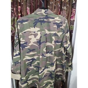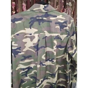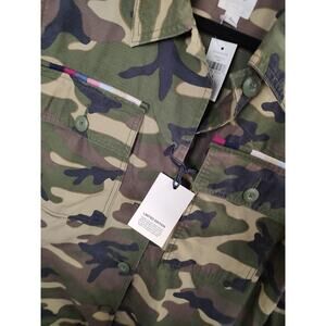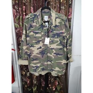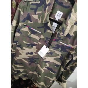 The product is a limited edition Gap camo jacket in size Large. Made of cotton with a camouflage pattern, this military-style jacket features a button closure and multicolor design. It is designed for everyday wear and is brand new with tags, priced at $98. This unisex jacket is perfect for those who appreciate outdoor themes and army-inspired styles, adding a unique touch to any wardrobe.