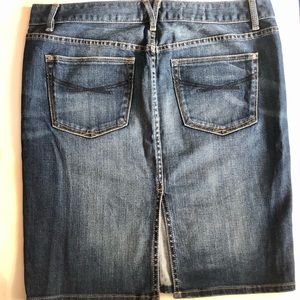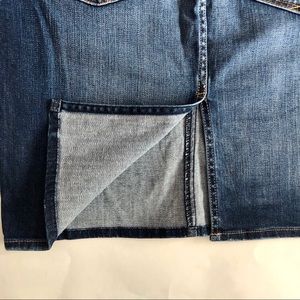 Dark vintage color. Versatile jean skirt goes with everything! Wear it with tights and boots this winter. Zipper and button closure. Three front pockets, two back pockets. Slit up back. Soft with a hint of stretch.