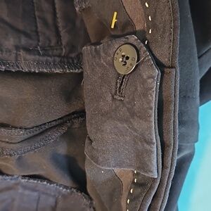 Features front and back pockets and a flat front design. The color is a very dark navy, almost midnight blue.