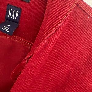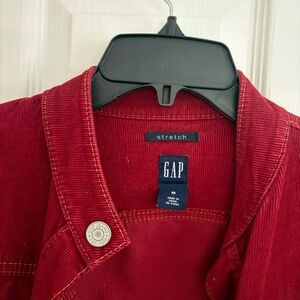 Gap Medium dark red corduroy jacket. The fabric has stretch and the fit is slightly oversized. Mandarin style collar, snap closure. side and internal pockets.
