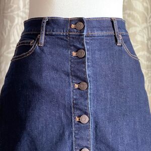 Description: stretchy dark wash denim button front high waist, mini skirt by gap in US women’s size 0.