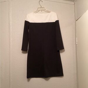 Gap Factory Long Sleeve Colorblock Shift Dress in Ponte - black features a color block design, with a white upper portion and a black lower portion. It has three-quarter length bell sleeves and a shift silhouette, meaning it falls straight from the shoulders. dress is made from ponte knit fabric, which is a soft and structured material.