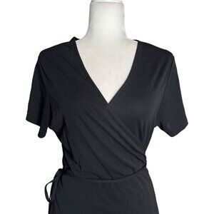 Gap Factory Full Wrap Dress Large Black Short Sleeve Tie Waist Rayon Stretch