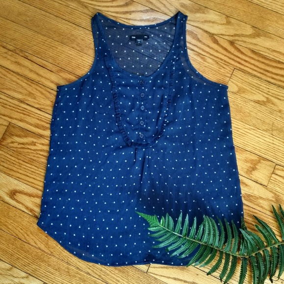 Sweet little tank from Gap Factory. White stars on a classic navy background for a nautical/patriotic flair. Flowy, sheer polyester material with a scoop neck and an adorable button and ruffle detail. Rarely worn, in great condition.
