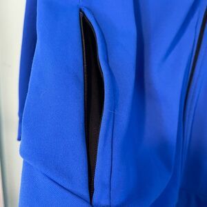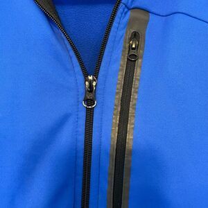 Y2K Gap Fit Dry Athletic Jacket in Royal Blue with Black accents. It is long sleeve, has a full front zipper closure, has three front zipper pockets (one zipper is broken), two inside slide pockets and a stand collar. Great for running, working out, soccer, the gym, running errand or just lounging around. It would make a great Christmas Hanukkah Valentine’s Day Birthday or any Holiday gift!