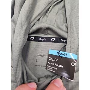 The product is a men's large active hoodie from Gap's Gapfit product line. It is a green, lightweight performance shirt designed for casual wear and activewear occasions. With its comfortable design and activewear functionality, this Gap Fit shirt is a versatile addition to any man's wardrobe.