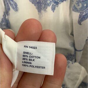 This elegant midi dress showcases a classic white and blue floral pattern with a lightweight cotton/silk blend shell. Featuring delicate cross-back straps, it offers both comfort and style. The polyester lining ensures a smooth fit, perfect for adding sophistication to a variety of settings.
