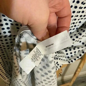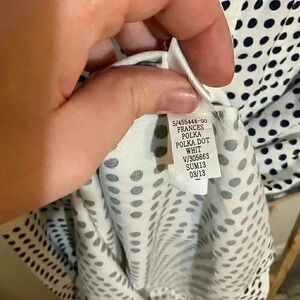 Gap Frances polka dot dress is a classic T-shirt dress made of rayon material. It has a V-neckline and is sleeveless, perfect for summer and spring. The dress length is midi and the polka dot pattern is in white/navy blue. It is suitable for travel, party/cocktail, casual, and workwear occasions. The dress is available in size small and is a regular fit.