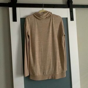 Gap tunic top in a neutral oatmeal heather. The body is a buttery-soft, cozy knit material. Ribbed material on sleeves and bottom hem. Funnel neck is loose and flattering.