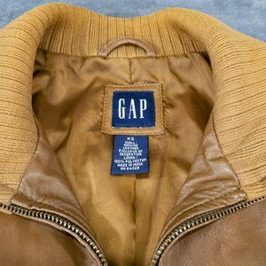 This XS women’s Gap leather jacket is in excellent used condition. It features very soft leather in a caramel brown color with elastic cuffs and waistband an elastic collar. The satin finish liner is in great condition with no damage or stains and has 2 front zippered pockets.