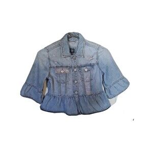 Gap Girls Denim Jacket Sz 4 Button Close Lightweight Distressed Peplum Hem Pocke