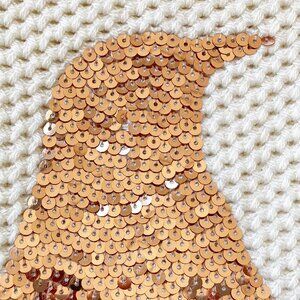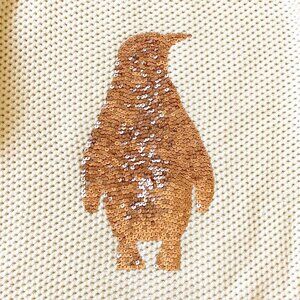 Cozy open-knit sweater featuring a sparkly sequin penguin graphic on the front. Soft, comfortable, and perfect for winter or holiday outfits.