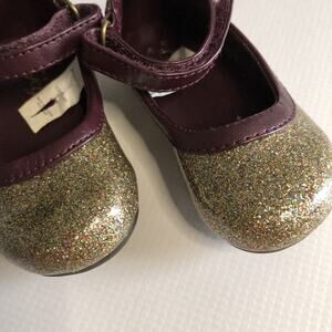 Super sweet Mary Jane flats. Velcro in great shape. Minor wear. Gold glitter with burgundy trim. Size 5.