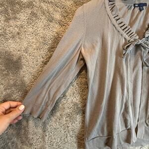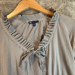 Gap Gray Cotton Cardigan Sweater Open Tie Neck Ruffle 3/4 Sleeve S Small Y2K