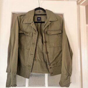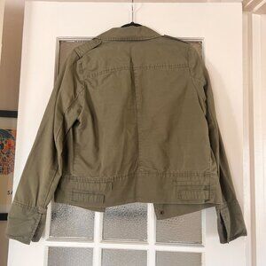 Never worn, cute green army jacket. Perfect for the cooler autumn weather! It has two front chest pockets and can pair with a dress or with a t-shirt and jeans.