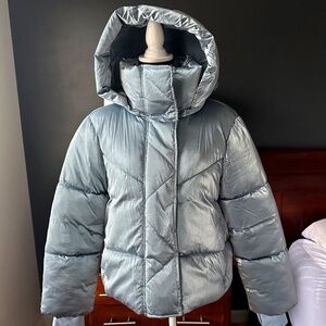 Women’s puffer ski jacket has zipper and snap closure. Side pockets and detachable hood. Beautiful shiny material is light blue/gray. No holes or stains. Only worn once. Very warm and fits true to size. Check size chart on Gap,com for specifics on measurements of a size small jacket. From a pet free smoke free home.