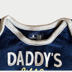 Gently used Gap Infant Baby “Daddy’s Little Gentleman” Snap-Bottom One-Piece in Blue, Size 6-12 Months. Made from soft, cozy fabric with an easy snap closure for quick changes. Perfect for everyday wear or as a cute gift for a little gentleman in the making!