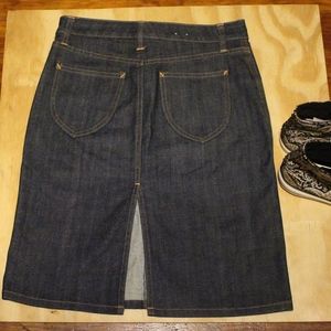 Not your mom's denim mini from the 80's! Crisp dark blue wash with orange stitching detail, slit in the back. Belt loops.