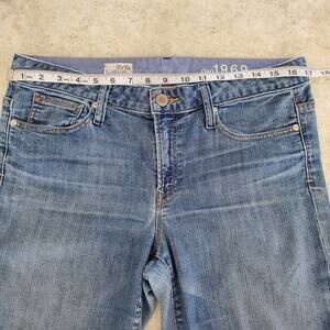 These soft medium wash bootcut jeans will pair perfectly with your favorite platform sandals and clogs. The hems are unfinished. Jeans run slightly big in the waist. There is a small beige spot on the front right leg to the side of the knee, shown in picture 4.