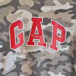 Gap Kids Boys Gray Camouflage Crew Neck Kidcore Sweatshirt with Logo. Features crew neck, ribbed cuffs & hem, and signature Gap logo across the chest.