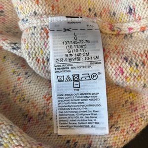 Cozy, colorful donegal sweater. Gathering at shoulder on sleeve, rib cuffs