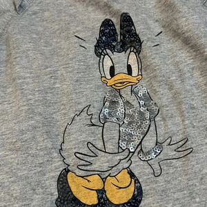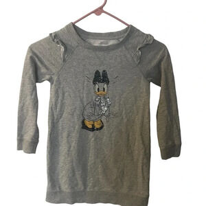 Grey Daisy Duck sweater/sweatshirt dress. Daisy’s shirt, bow and shoes are sequences. Ruffle detailing on sleeves.