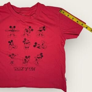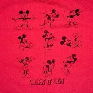 Description: Vibrant red short-sleeve graphic tee featuring iconic Mickey Mouse in various workout poses with the text "Work It Out." Perfect for young Disney fans, this lightweight and comfortable shirt is ideal for casual wear.