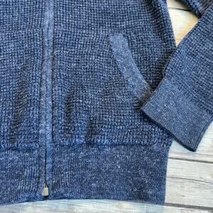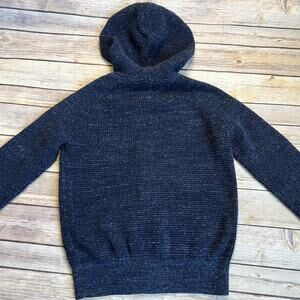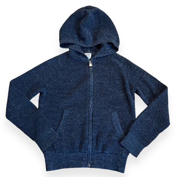 Size Medium Gap Kids, navy blue textured zip-up hoodie sweater. Gorgeous and so soft! Zips all the way up the front. Pockets. 80% cotton 20% polyester. No stains or flaws. Very good used condition.