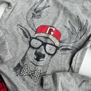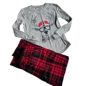 Get ready for cozy nights with this adorable Gap pajama set! This set includes a long-sleeve grey shirt featuring a cute reindeer print, paired with classic red plaid flannel pajama bottoms. Perfect for the holiday season or any chilly night, this set is sure to bring a smile to your little one's face.
