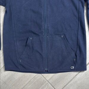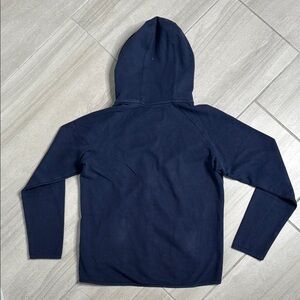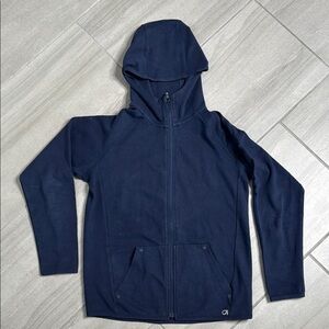 Stylish navy blue hooded jacket with a zip-up front. Features front pockets for convenience.