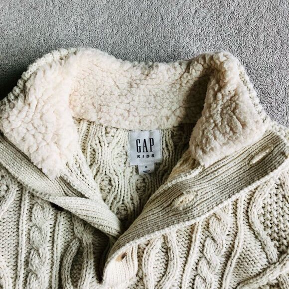 Cable knit, mock collar lined w/ faux fur Sherpa fleece, 3 buttons at chest
