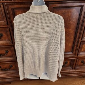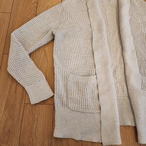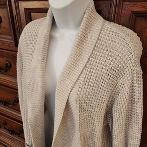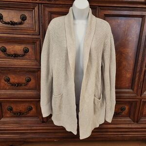 Pre-loved Gap Open Stitch knit cardigan. Size large with some stretch. Color is called Pale Grey Heather which is a very light grey that almost looks like a cream color in certain lighting. Has two bottom front pockets. Has a fold over collar that goes all the way down the front. Id say it's medium thickness. 100% cotton. RN# 54023. CA# 17897. Made Oct 2016 and still has plenty of life to it!