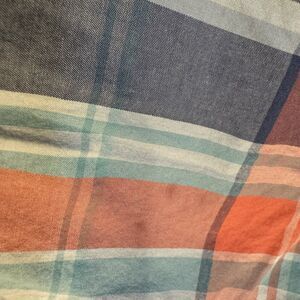 Pattern: Vibrant blue, red/pink, and white plaid or madras pattern.