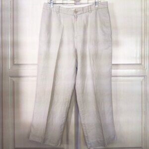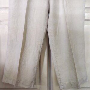 -EUC Gap Loose Fit, 100% Linen, Cropped Trousers in Light Khaki, Size 12, Retail $70. 2 front slant pockets and 1 back button welt pocket. Approximate measurements are taken lying flat and unstretched - Waist 15.5", Hip 23", Rise Length 11", Inseam 24", Length Waist to Hem 34", Leg Opening 10". Machine wash cold, tumble dry low or line dry, and low iron.
