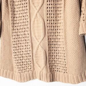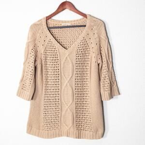 Gap London women’s V-neck cable knit sweater in soft beige cotton. Women’s size large. Features a relaxed silhouette with open-knit panels, a midweight texture, and ribbed trim at the hem and cuffs. The drape and structure balance comfort with polished simplicity, making it an easy layer for both work and weekend wear.