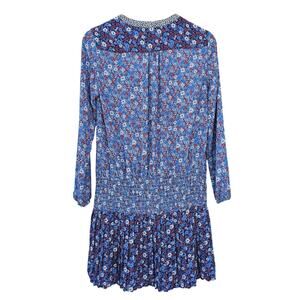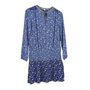 Gap Long Sleeve Pleated Dress in Blue Floral Print. Size XS / Extra Small. Features tie neck, long sleeves, smocked elastic dropped waist, pleated skirt, floral print, and mini length. Style 526660-01. 100% Polyester. Excellent pre-owned condition, no flaws.