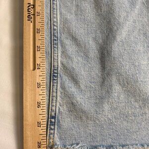 Some distressing on knees and frayed hems by design. Waist = 32 inches; Inseam = 28 inches; Rise = 11 inches. Measurements are approximate & may be affected by wash, wear & stretching. Jeans are 31/12R but waist measurement 32”.
