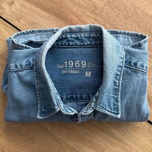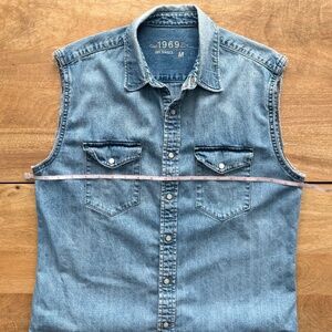 Distressed style. Soft blue denim. Pearl snaps. Two front pockets with snaps. Button neck. Cotton 100%.