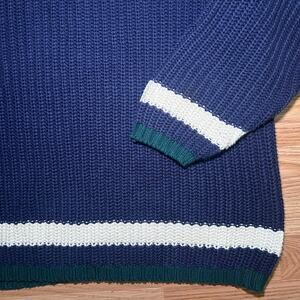 A timeless staple with UK pedigree—this deep navy Gap sweater is effortlessly cool and well-made, crafted in 100% cotton and featuring classic green and white stripes at the collar, cuffs, and hem. The heavyweight knit and slouchy XL fit give it that perfect grandpa-core silhouette, while the UK-made tag signals quality you don’t see in modern pieces. Style it preppy over a collared shirt or layer it loose for a cozy, vintage-inspired look. In excellent condition with no flaws, this sweater blends heritage construction with current fashion energy. Add it to your fall/winter rotation or stash it for layering year-round.