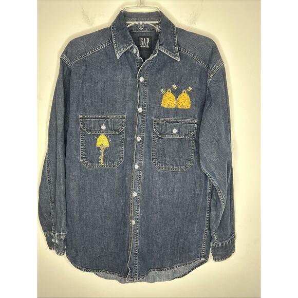 Gap Men’s Denim Shirt Long Sleeve Button Up Small Honeybees/Hive Patchwork