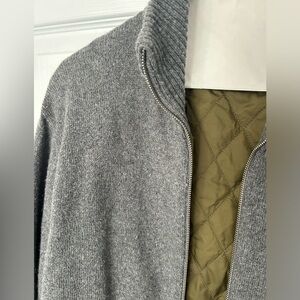 Good condition sweater jacket with quilted green lining. Pockets. Medium warmth. Slight pilling at the bottom. Smoke and pet free home. I ship fast!