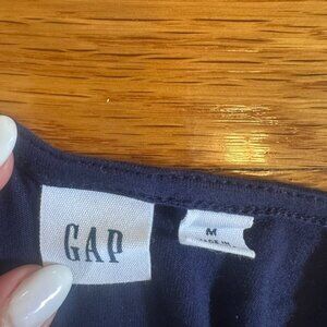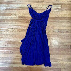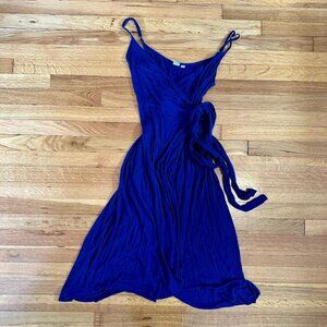 This blue tank-top midi Gap dress (size M) is made of very comfortable, stretchy material. The wrap style creates a v-neck cut and makes the dress very adjustable.