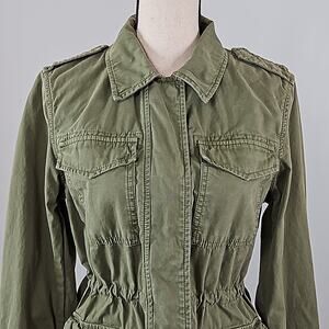 Utility style jacket from Gap. Durable, 100% cotton in an olive green reminiscent of military fatigues. Features: