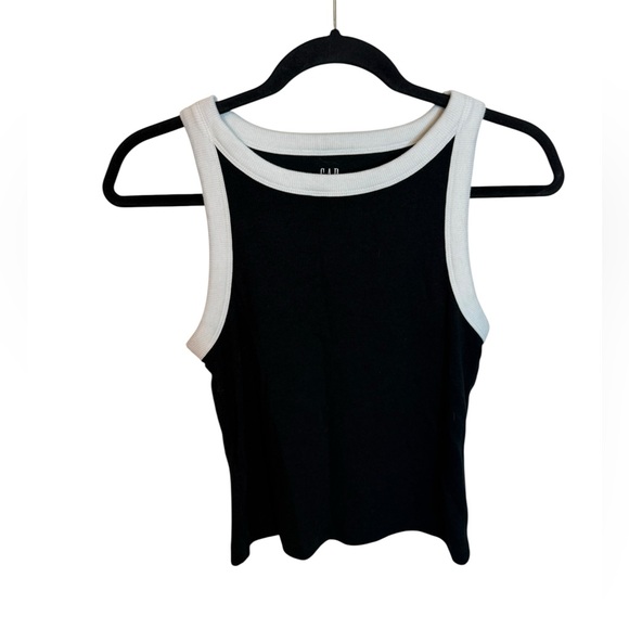 Pre owned like new. Adorable cropped black ribbed tank with halter neck and white trim. So cute and a great casual tank for summer. WOMENS size small.