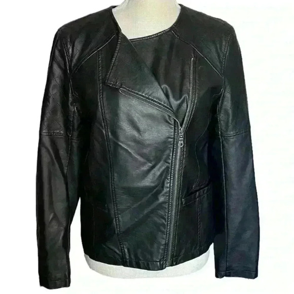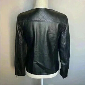 Machine washable faux leather jacket. Excellent used condition. No rips tears or stains Armpit to armpit 17.5" Shoulder to hem 22" Shoulder to cuff 23.5"