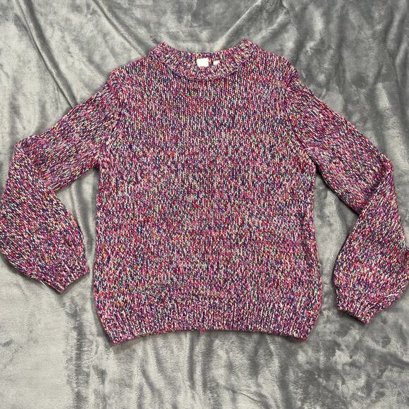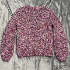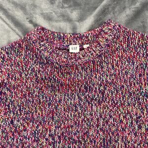This is a Gap women's sweater in size small. It features a crew neck, long sleeves, and a multicolor marbled knit fabric. The style is a classic crew neck sweater with a cozy and trendy design. Perfect for adding a pop of color to your casual outfit. It is a heavy knit sweater and super warm.