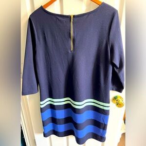 This is such a cute little long sleeve dress! The Navy Blue with the mint green and cobalt blue stripes on the bottom are such fun colors to meet together 💃 I just loved this dress!! This dress is in excellent, preloved condition and has a lot of unique colorful life left to wear and show, left to live!!