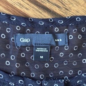 Navy blue white circle pattern Gap top women's size M. Cute summer top in a sleeveless style with smock detail and buttons on bodice. Pair with white jeans or shorts for the perfect casual simmer outfit.